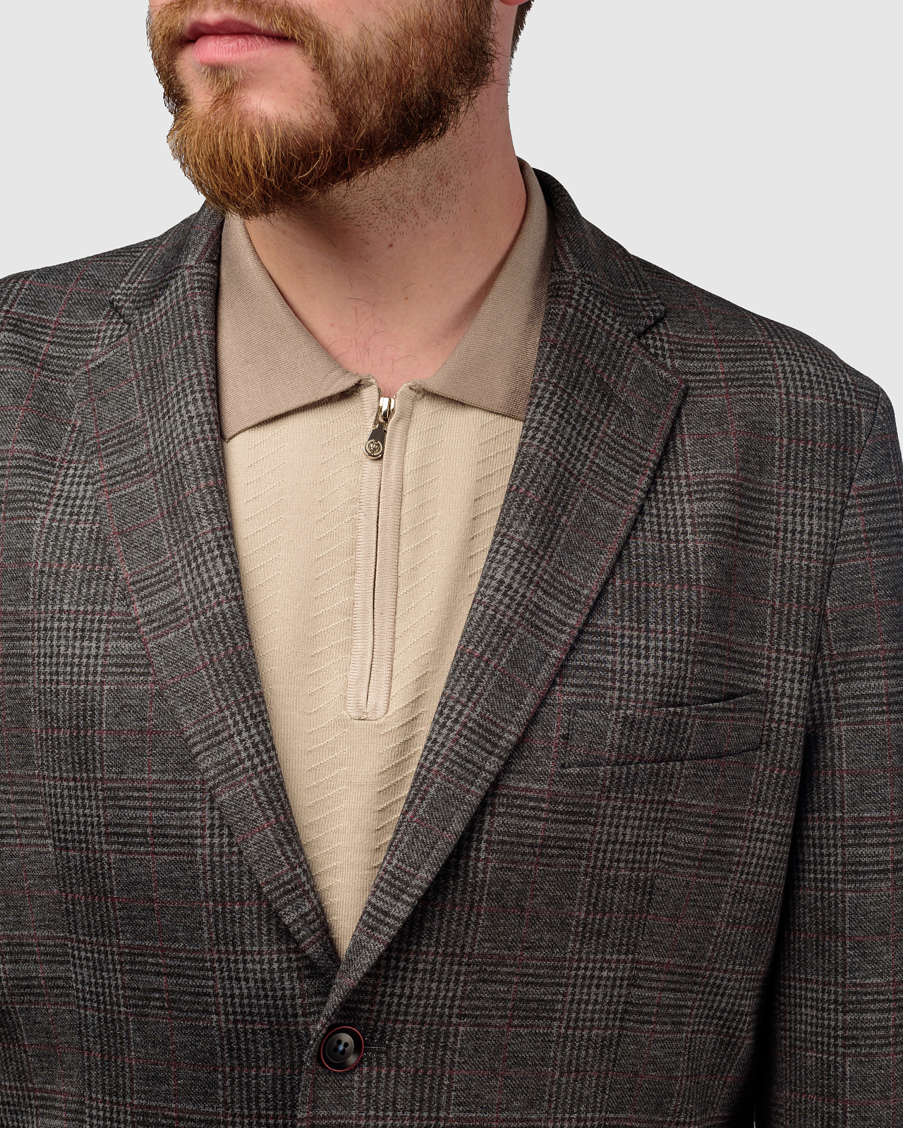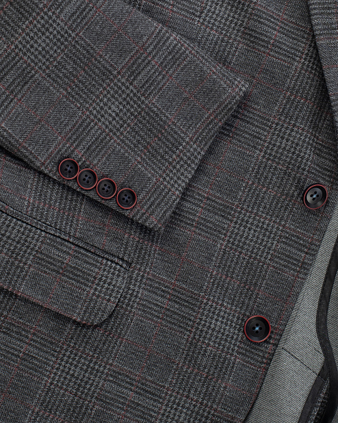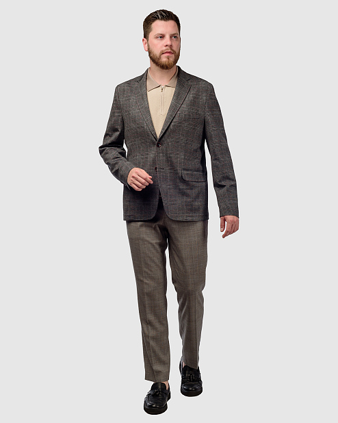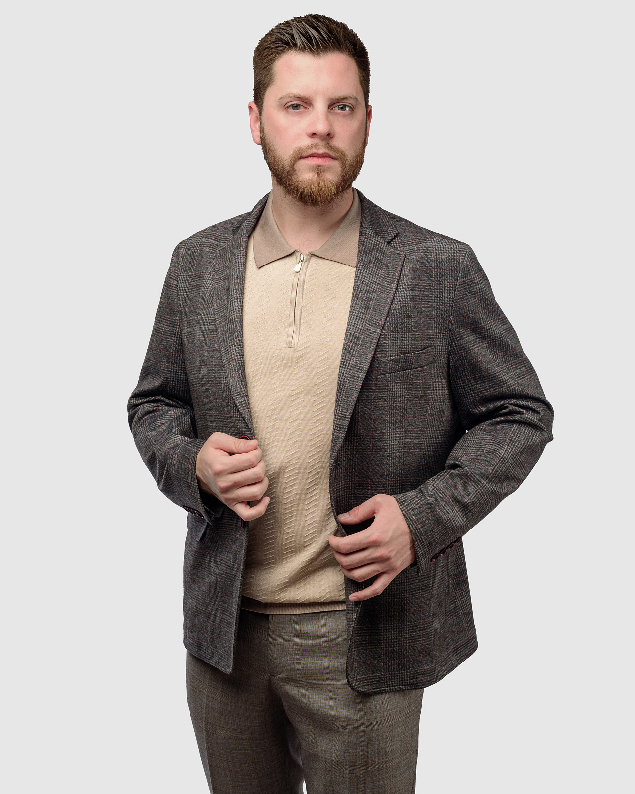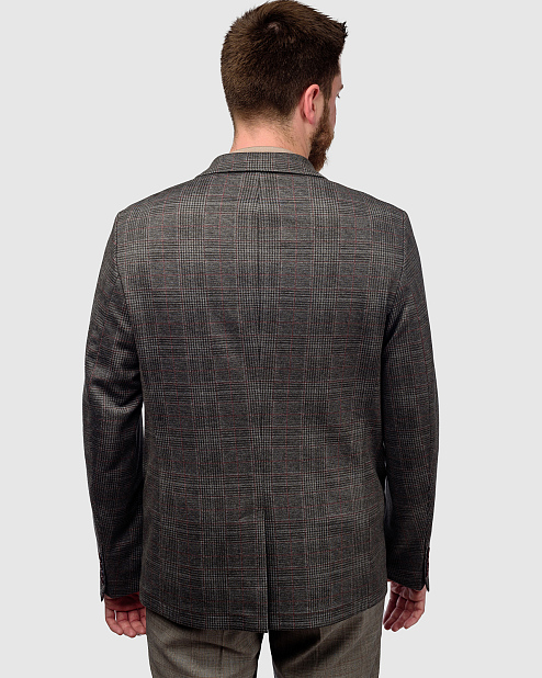 Повседневный однобортный пиджак «Бекер» выполнен из смешанного трикотажного полотна с актуальным рисунком в клетку серого цвета с терракотовыми вкраплениями. Благодаря преобладанию вискозы в составе и эластану, пиджак комфортен в носке и не сковывает движений. Это облегченный пиджак с мягкой линией плеча, с застежкой на две пуговицы, лацканами, карманами с клапанами и нагрудным карманом листочка. Спинка с одной шлицей. Внутри частичная подкладка и контрастная окантовка. Пиджак прекрасно сочетается как с классическими брюками так и с хлопковыми чинос или джинсами в комплекте с легким джемпером или майкой «поло». Трикотажный пиджак является универсальной моделью, и позволит уверенно себя чувствовать как в офисе, так и на прогулке или в путешествии, ведь он компактен и помещается в ручную кладь и при этом практически не мнется.